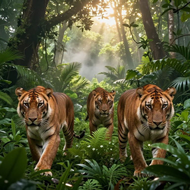 Photograph of three majestic tigers with orange and black striped coats, walking through a dense, sunlit jungle with lush green foliage.