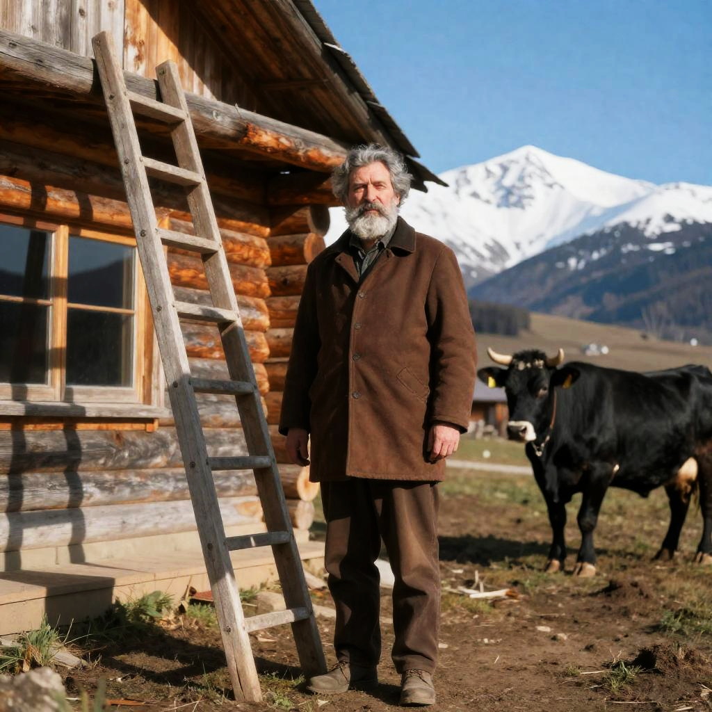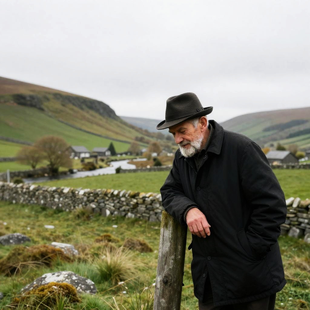 Old man with white beard, black coat, and dark hat, leaning on a wooden post, looking down. Lush green landscape with hills, river, stone walls, and scattered buildings in the background. Overcast sky. Mountain in distance. Countryside setting.