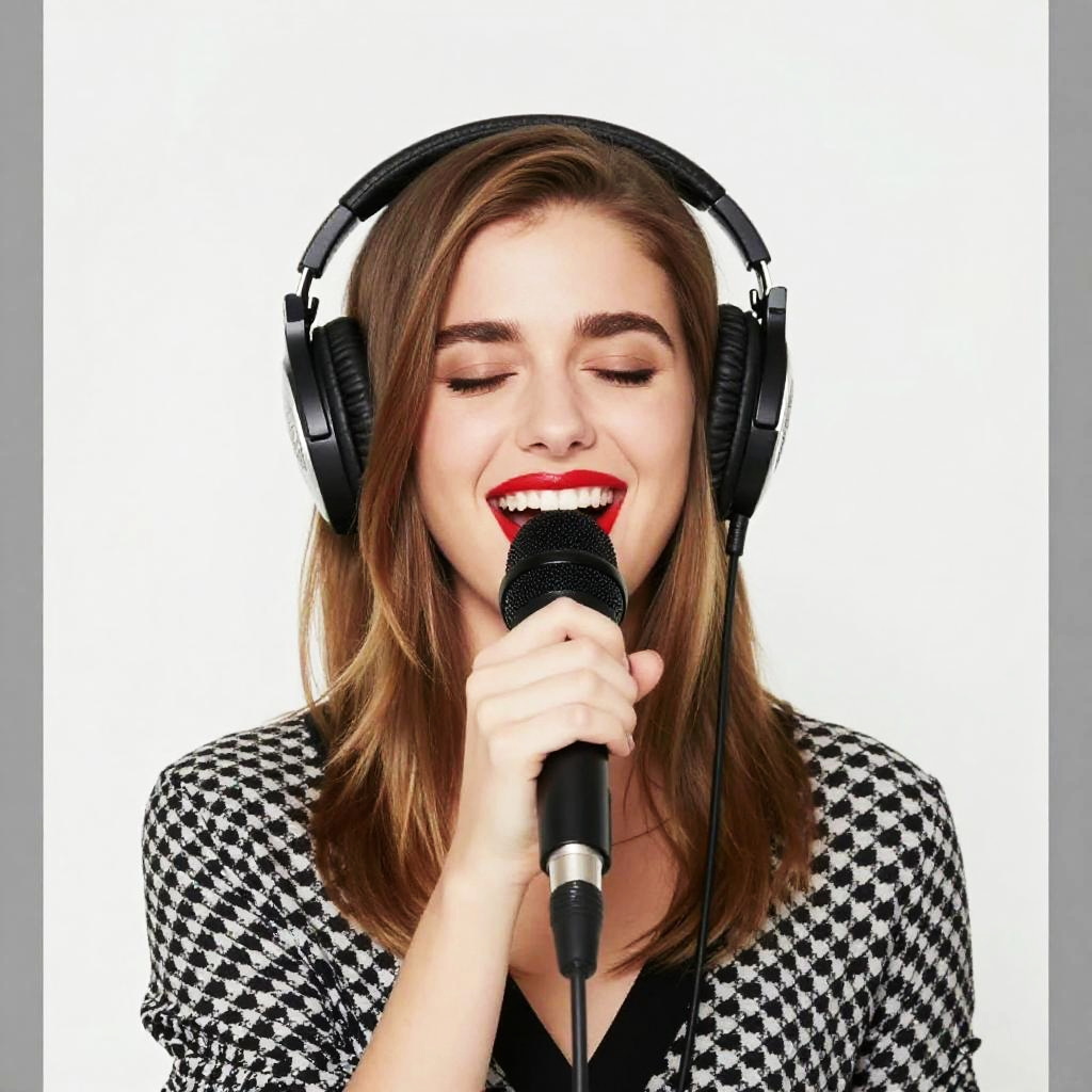 Young Woman Singing with Headphones and Microphone