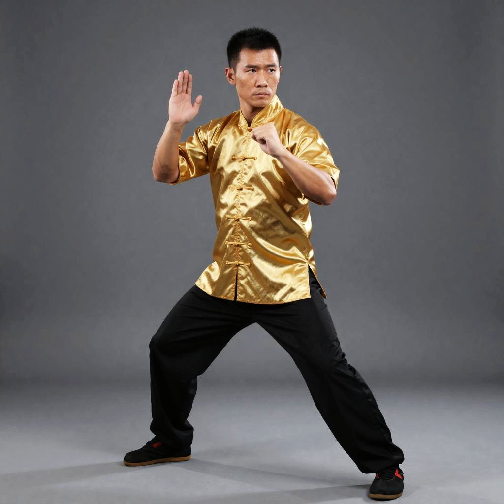 Wing Chun Kung, man in a golden shirt and black pants with his hands up