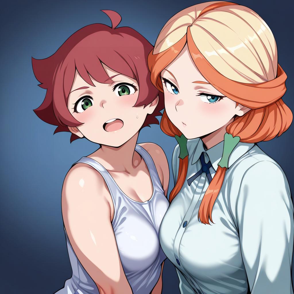 Amanda o'neill, little witch academia, 1girl, green eyes, short hair, orange hair, two-tone hair, red hair, ahoge, medium breasts, by artist matoyama, illustrious