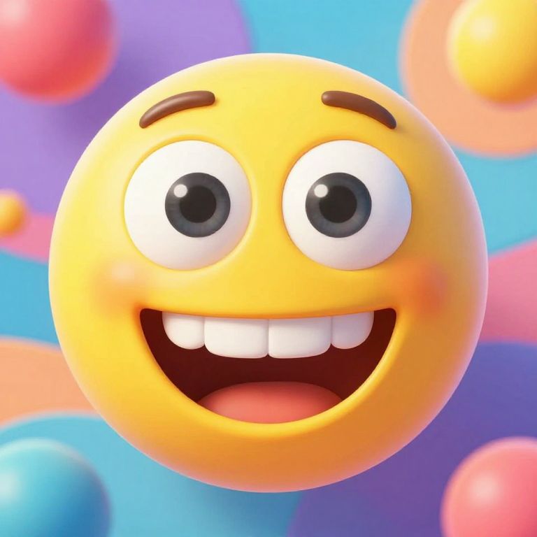 Smiley pic of a vibrant yellow cartoon face with big expressive eyes and a wide joyful grin, set against a colorful abstract background, high resolution, playful and cheerful atmosphere, digital art style