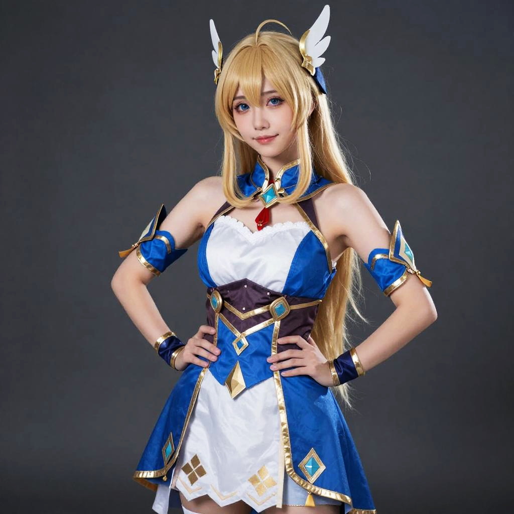 A woman poses confidently in a detailed and realistic cosplay costume inspired by Anya Alstreim, featuring a blue and white dress adorned with gold accents and wing-like headgear. The image has a polished, professional look with a dark, simple background emphasizing the vibrant colors and intricate design of the outfit.