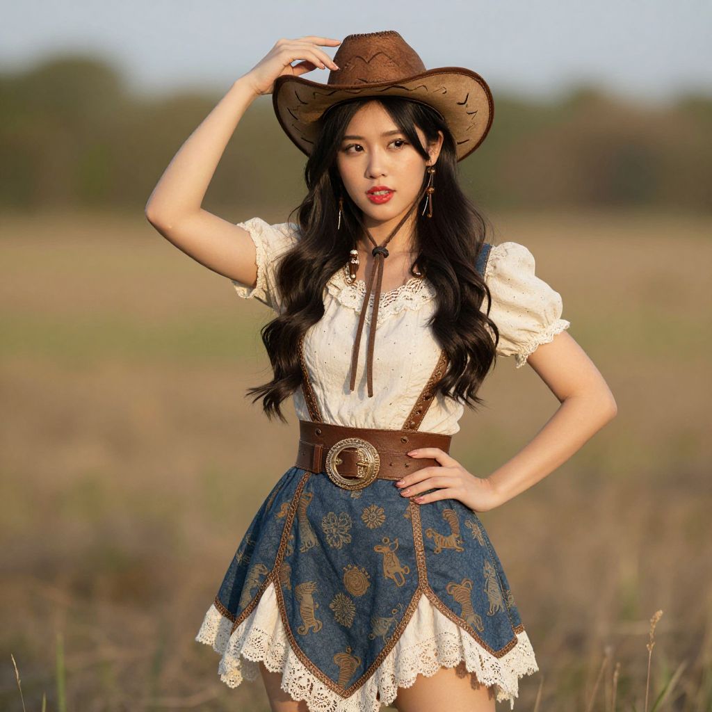 Photograph of an Asian woman with long black hair, wearing a brown cowboy hat, white lace blouse, and blue floral skirt, posing in a sun