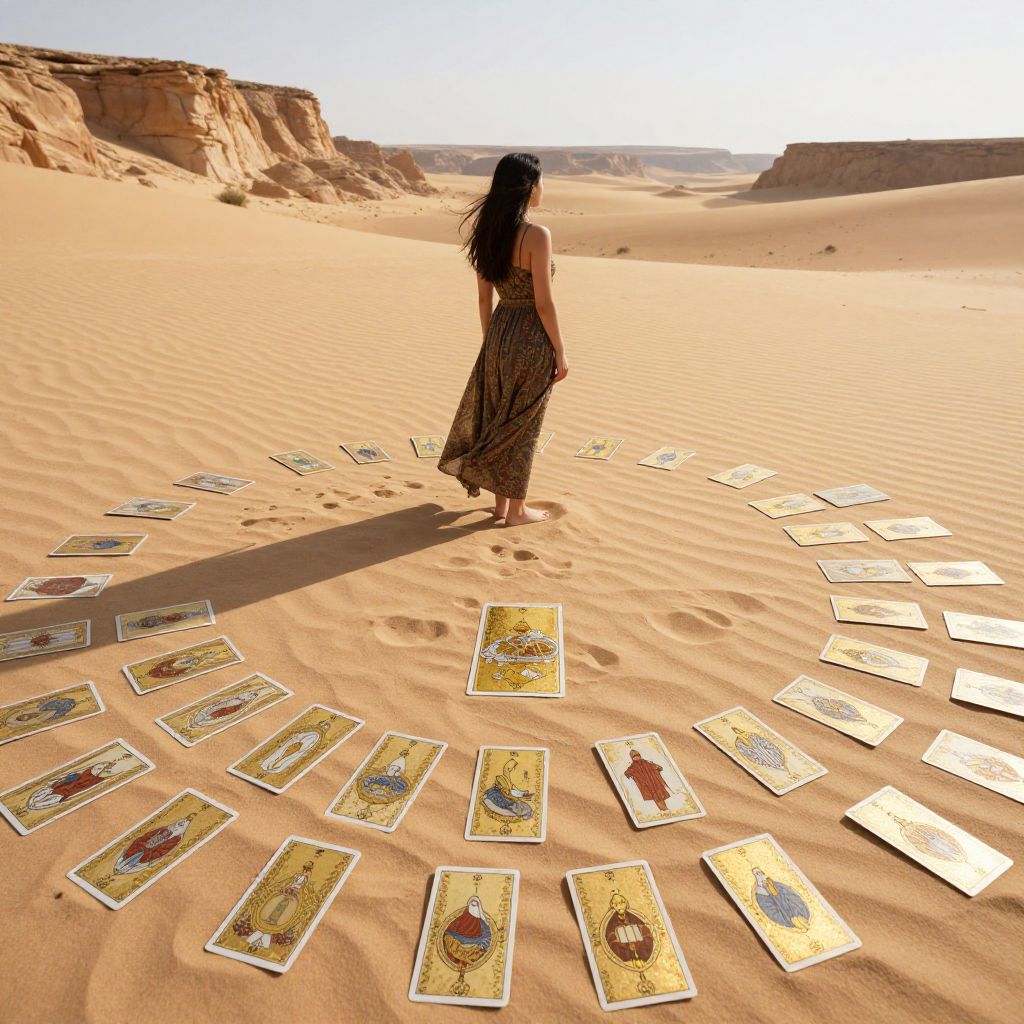 Photograph of a lone woman with long, dark hair standing in a sunlit desert. She is wearing a brown, patterned, sleeveless dress that reaches her ankles. The sandy landscape is dotted with numerous colorful tarot cards scattered in a circular pattern around her. The cards feature illustrations of various figures and symbols. The sun is bright, casting shadows on the sand. The background reveals rocky, tan cliffs under a clear sky. Her shadow is visible on the sand, adding depth to the image. The overall mood is serene and mystical.