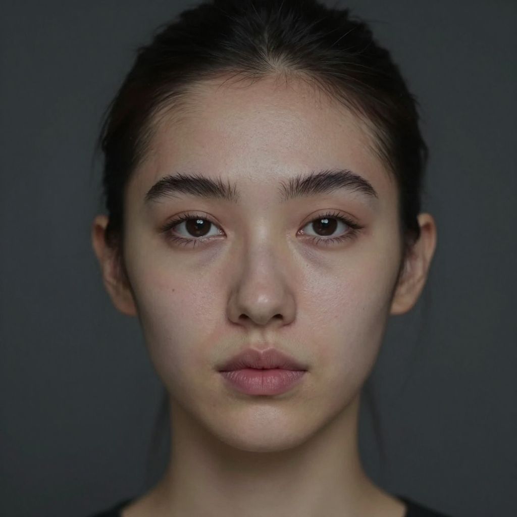 Photograph of a young woman with fair skin and dark brown hair pulled back. Her eyebrows are thick and dark, and she has large, dark brown eyes with a neutral expression. Her lips are slightly parted with a natural pink hue. She has a smooth complexion with subtle skin texture visible. She is wearing a dark-colored top, and the background is a solid, dark gray color, which contrasts with her lighter skin tone. The lighting is soft, highlighting her facial features evenly without harsh shadows. The image has a realistic, portrait-style quality.