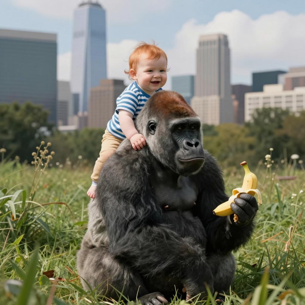 A baby with red hair and a striped shirt riding on the back of a large gorilla. The gorilla holds a banana in its left hand, sitting in a grassy area. The background features a cityscape with tall skyscrapers and a blue sky with clouds. The baby smiles, and the gorilla's face is relaxed with slightly open mouth. One child, one gorilla, urban cityscape background.