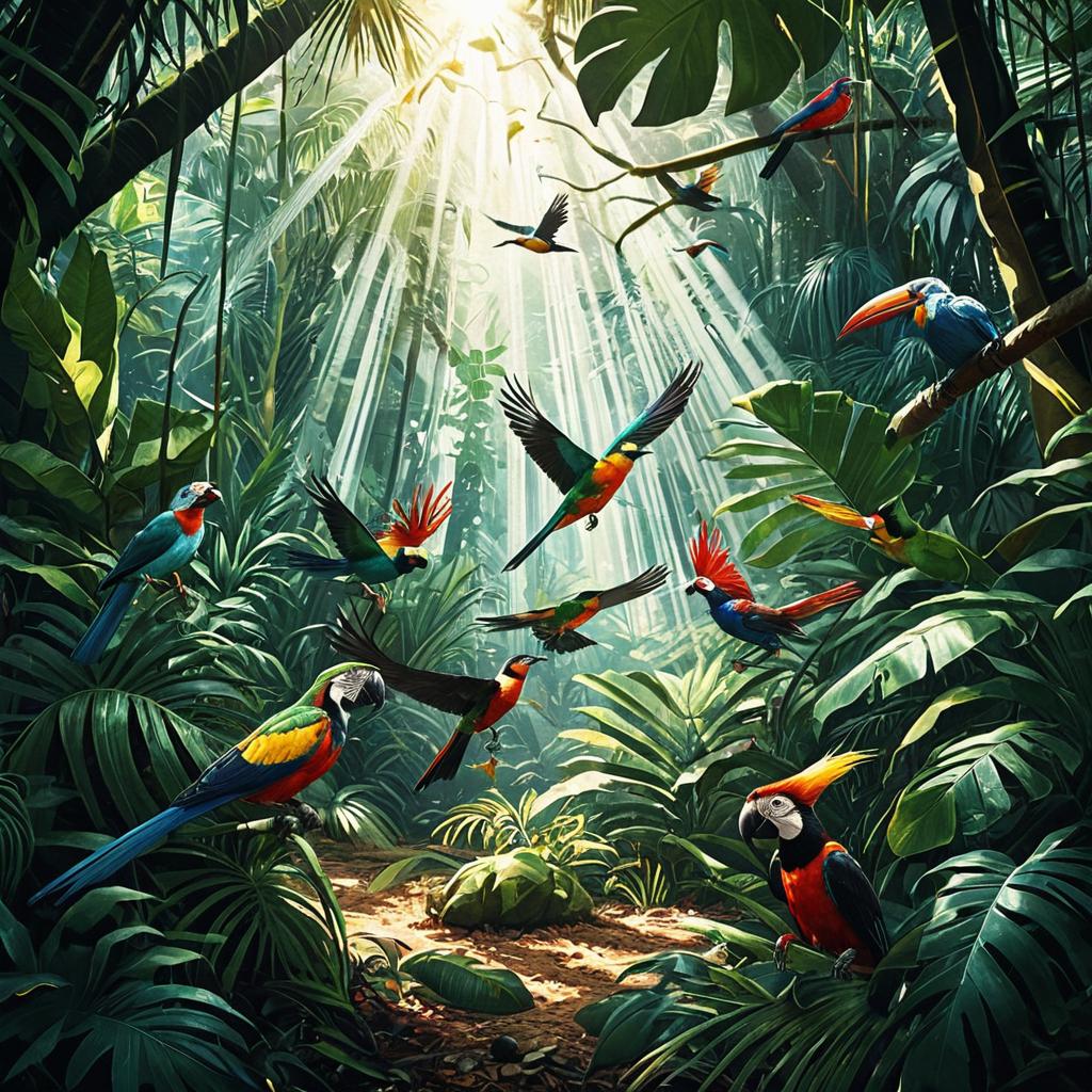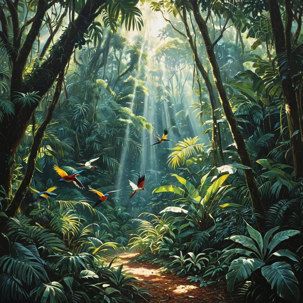 Lush tropical rainforest in humid jungle with diverse flora and exotic birds perched on branches, soft dappled sunlight filtering through canopy, realistic nature painting