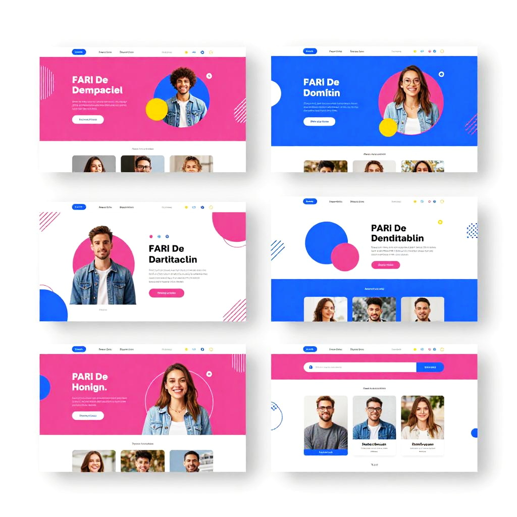 This image is a digital collage of four colorful web pages arranged in a grid. Each page features bright pink, blue, and white backgrounds with abstract circular patterns, images of people, and text boxes. The design is modern and vibrant, with a playful mix of colors and shapes. The layout is clean, with white spaces separating the pages.