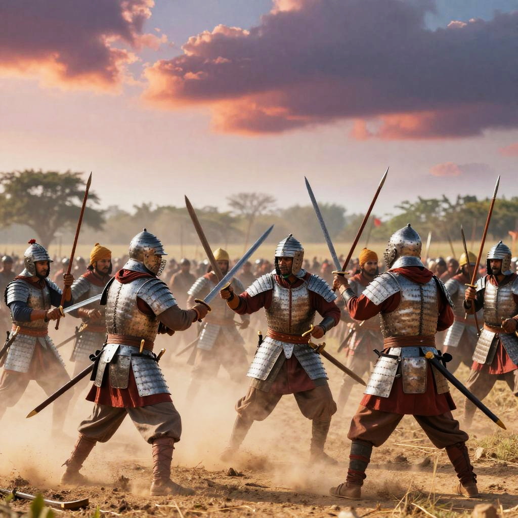 Panipat battlefield scene at dawn, detailed historical warriors in traditional armor clashing with swords and spears, dust rising from the ground, vivid skies and dynamic action, hyper realistic style with vibrant colors