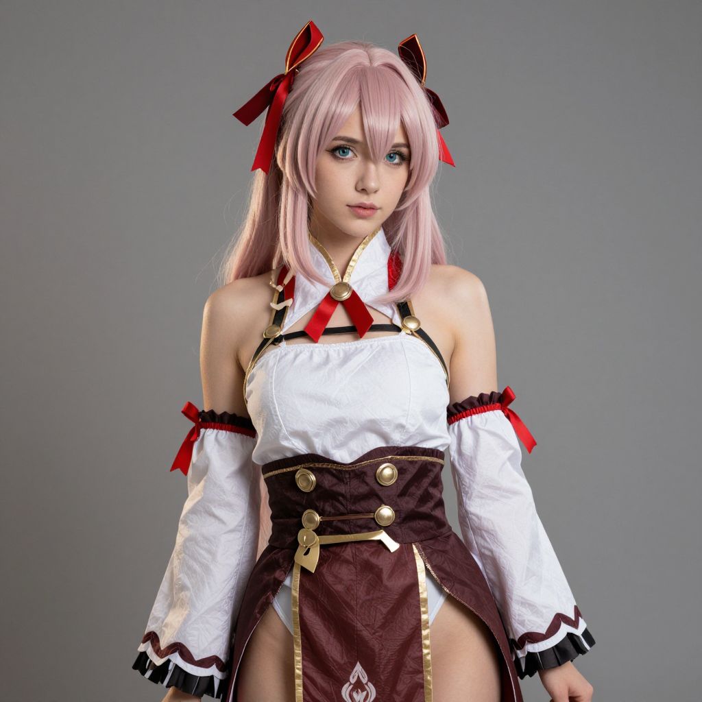Sexy cosplay woman character wearing Kagura Mikazuchi costume. Realistic photo. Jane Doe dressed as Kagura Mikazuchi. Realistic photo, caucasian woman, pretty face