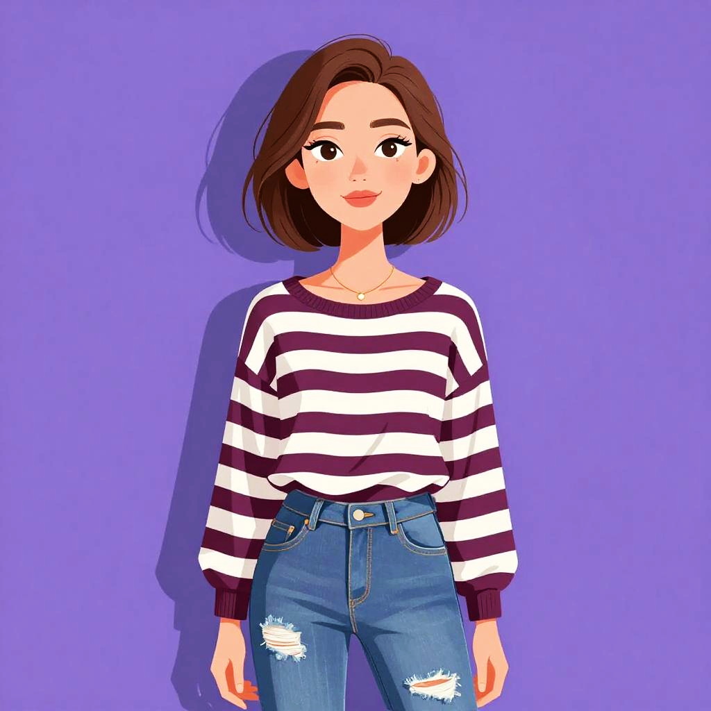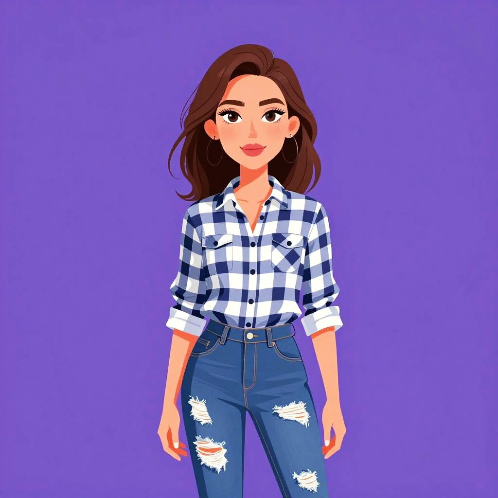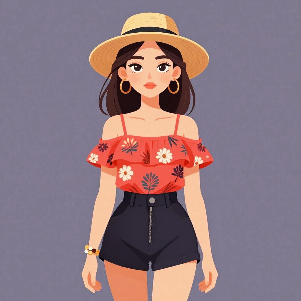 Woman with pretty face and pretty hair. Woman, trendy fashion, ribbed tan crop top with short sleeves, fitted silhouette, high neckline, black faux leather high-waisted shorts with intricate gold floral embroidery, form-fitting cut, mid-thigh length. --sref 1461
