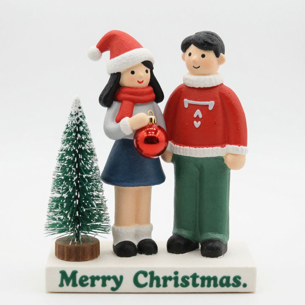 Couple Christmas ornament featuring two figures—a woman wearing a Santa hat and scarf, holding a red ornament, and a man in a red sweater and green pants—standing together with a small green Christmas tree to their left, all set against a white base inscribed with \"Merry Christmas.\