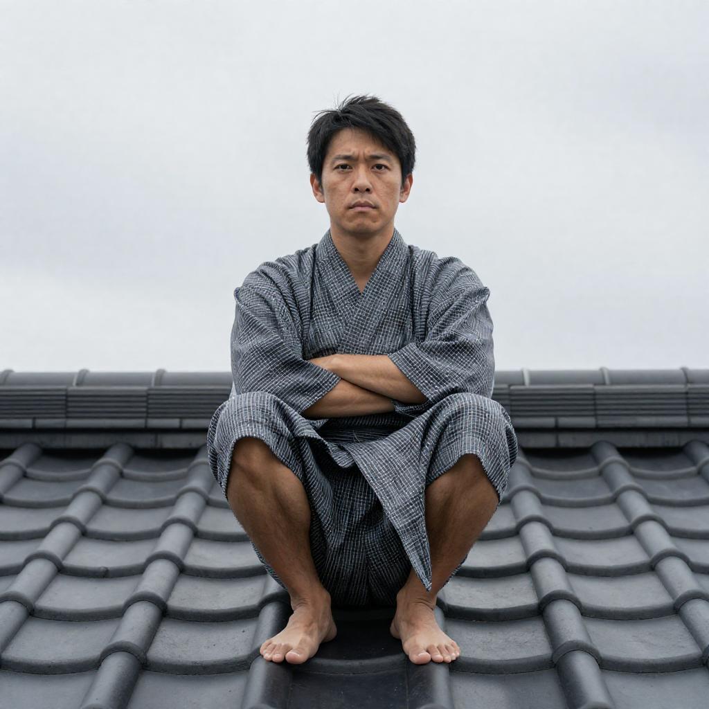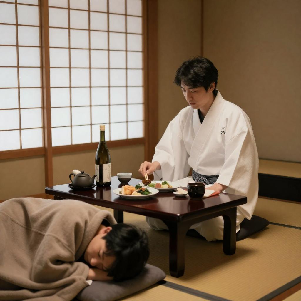 A photograph of a traditional Japanese room. A man in a white kimono sits at a low table, focused on food and drink. A person is asleep on the floor, covered by a brown blanket. Shoji screens and wooden furniture are in the background. A bottle, a teapot, and snacks are on the table.