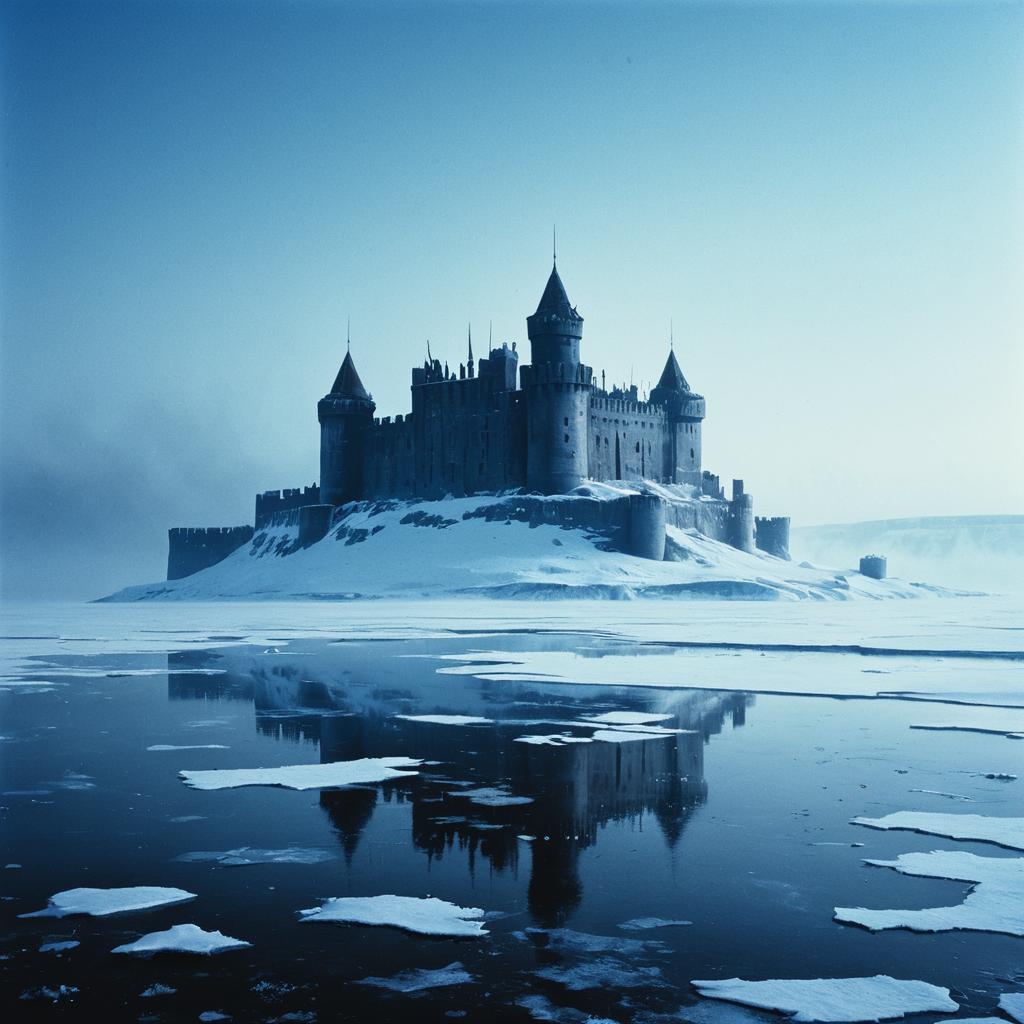 A painting of a large medieval icy fortress standing on a snow-covered hill, surrounded by a vast frozen lake with fragmented ice sheets. The scene is enveloped in cold blue lighting and fog, creating a haunting and desolate atmosphere.