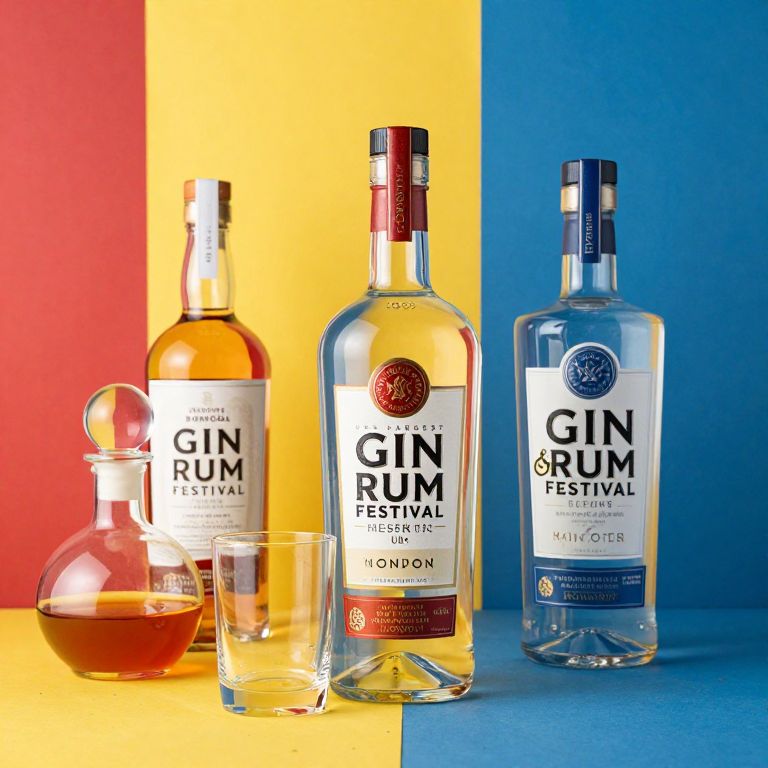Prominent gin and rum bottles, alongside a decanter and a glass, are showcased against vibrant color blocks, advertising the UK's largest Gin & Rum Festival in London.