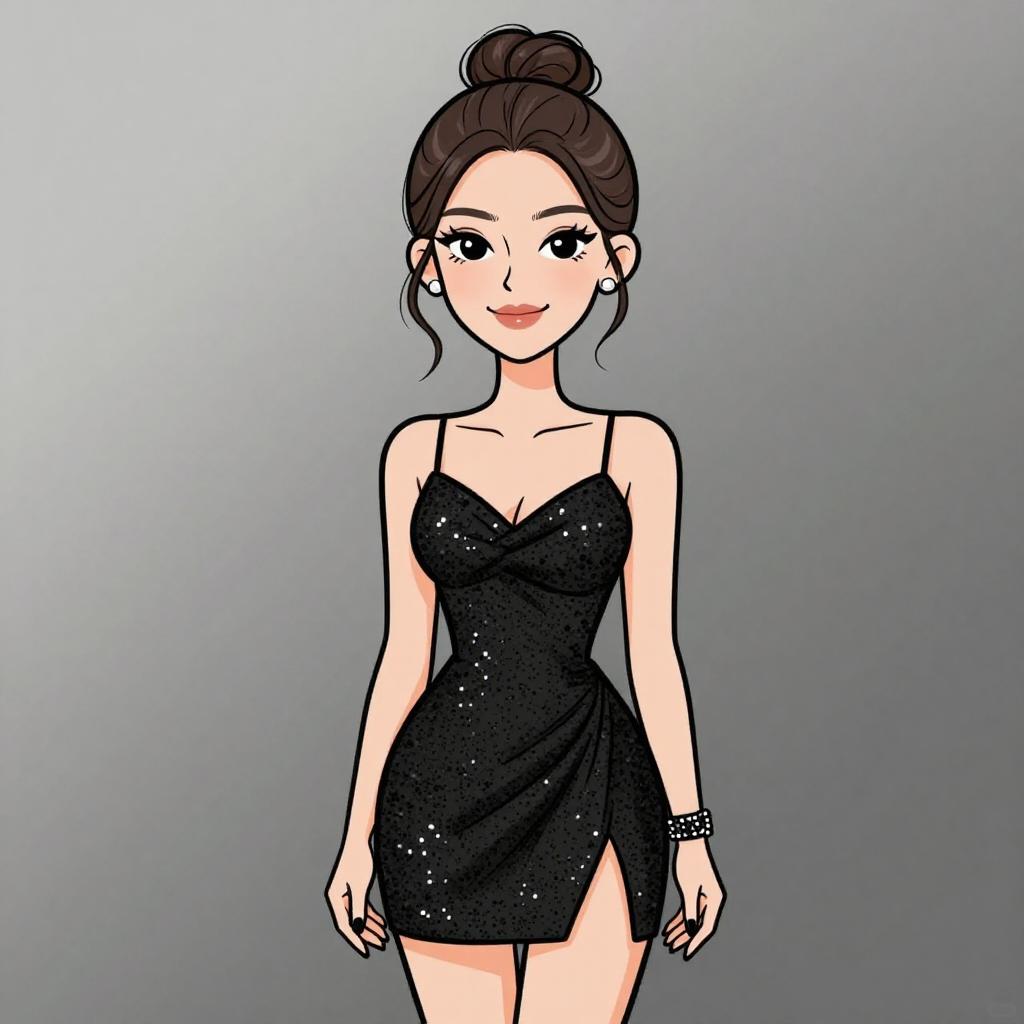 Woman with pretty face and pretty hair. smiling Woman, bohemian chic, black lace tunic dress, wide neckline that can be worn off the shoulder, three-quarter length bell sleeves with lace cut-outs, vertical lace panels on the bodice, thigh-length with scalloped lace hem, silver bangle on one wrist, grey studio background. --sref 1467