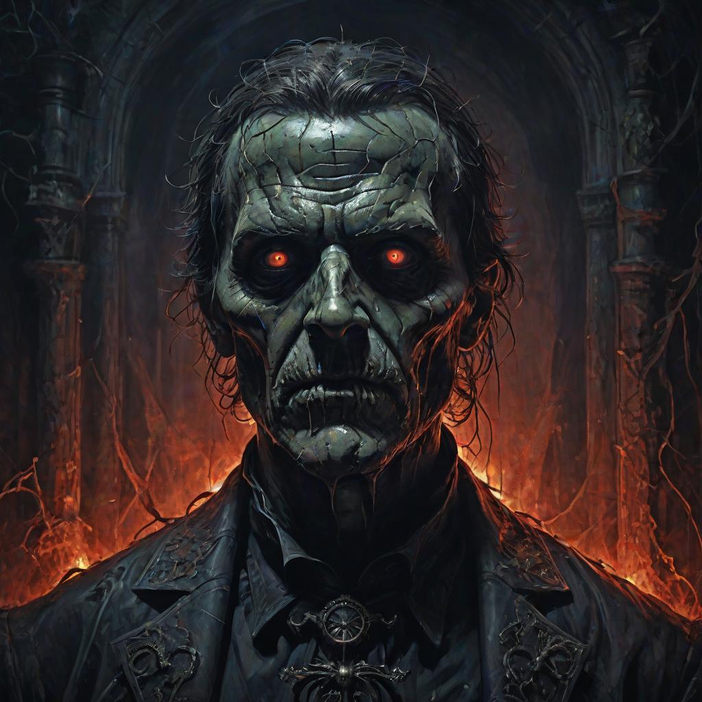 Digital painting of a haunting, cinematic close-up portrait featuring a gothic figure with pale makeup and dark, dramatic lines on the face. The subject wears an ornate black suit with intricate patterns and a detailed brooch, set against a shadowy haunted mansion background. The image conveys a brutal, majestic, and emotionally profound horror atmosphere.