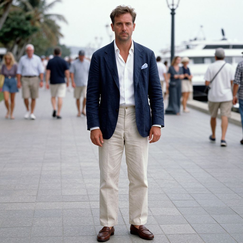 A man, navy linen blazer, white cotton shirt, beige chinos, brown leather loafers, light blue pocket square, busy waterfront promenade, kodacolor analog film, confident expression Man has masculine face and piercing eyes