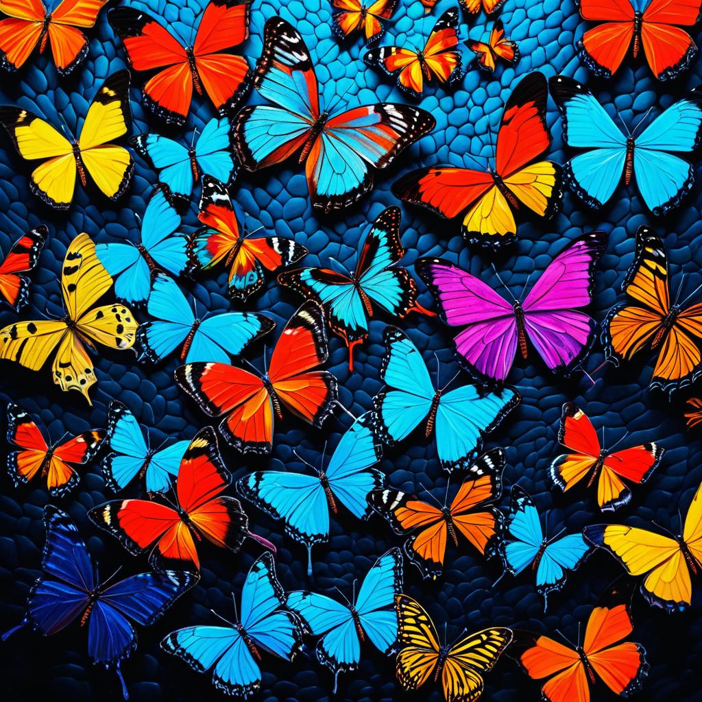 Colorful digital artwork featuring a dynamic composition of exotic butterflies with vivid tones of orange, yellow, blue, white, red, and purple set against a blue background. The image showcases vibrant surrealism with professional lighting effects enhancing the bold colors and intricate butterfly patterns.