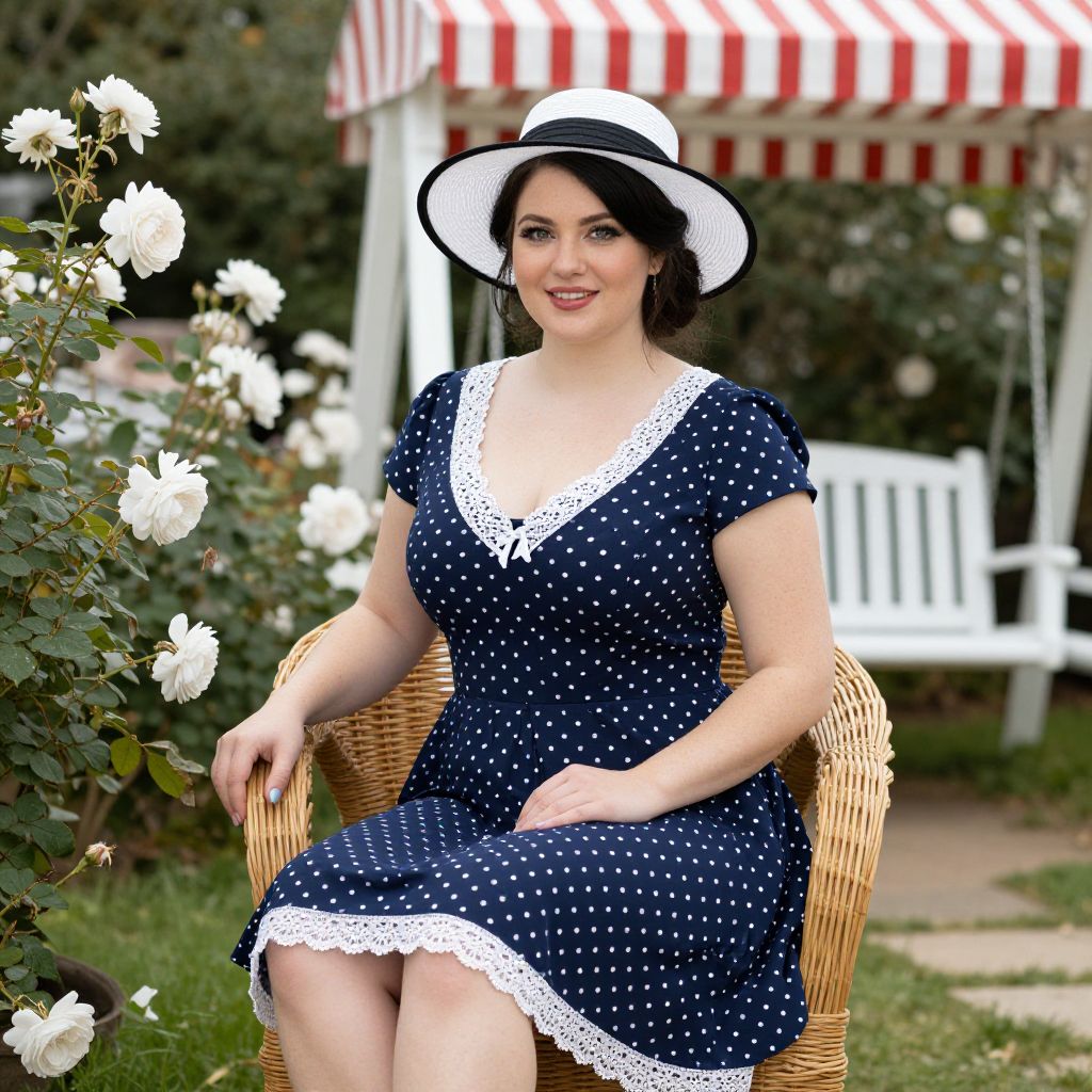 Photograph of a curvy woman with fair skin and dark brown hair styled in an updo, wearing a navy blue polka dot dress with white lace trim. She is sitting in a wicker chair in a garden surrounded by blooming white roses. The woman wears a black and white hat and smiles while looking directly at the camera. The background features a white swing set and a red and white striped awning.