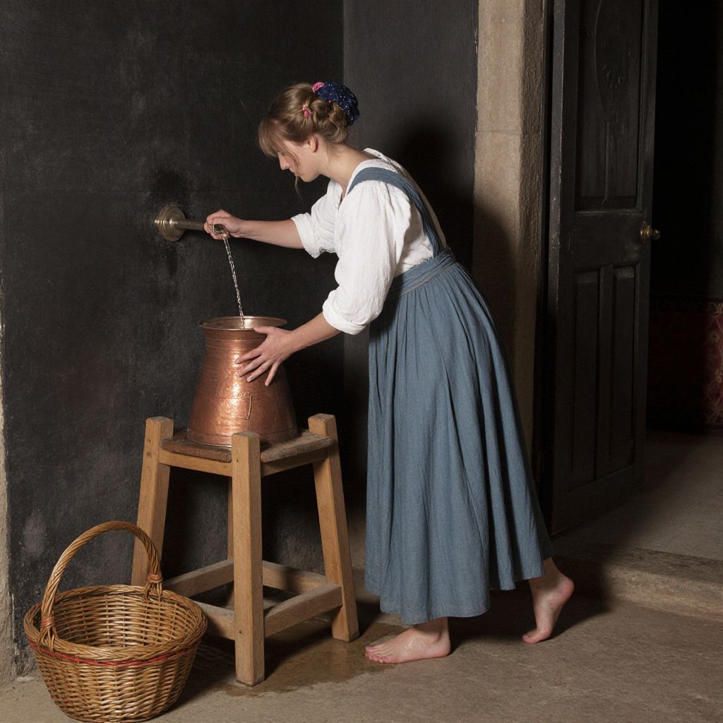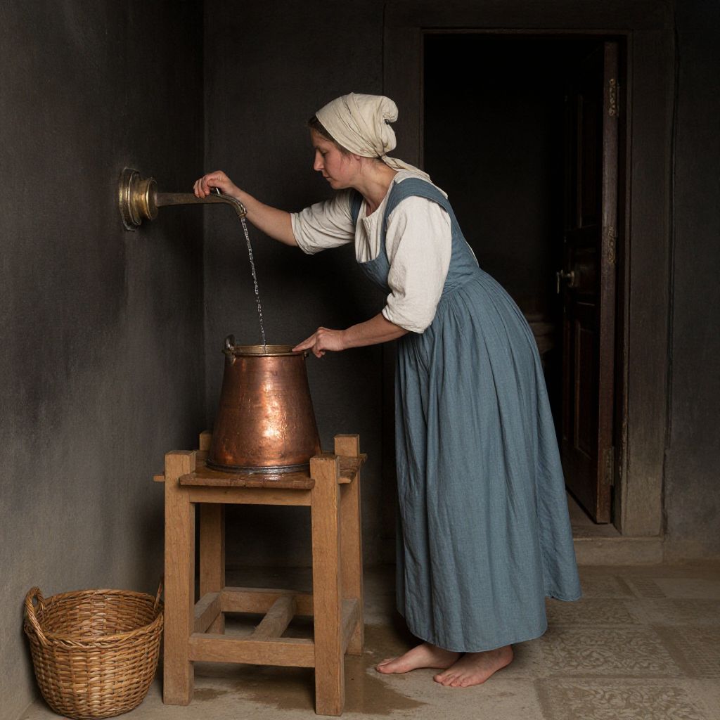 Woman in period attire draws water from a copper cistern elevated on a wooden stand, her bare feet resting on a muted floor as she stands beside a darkened wall with a partially open door to the right and a woven basket to the left.