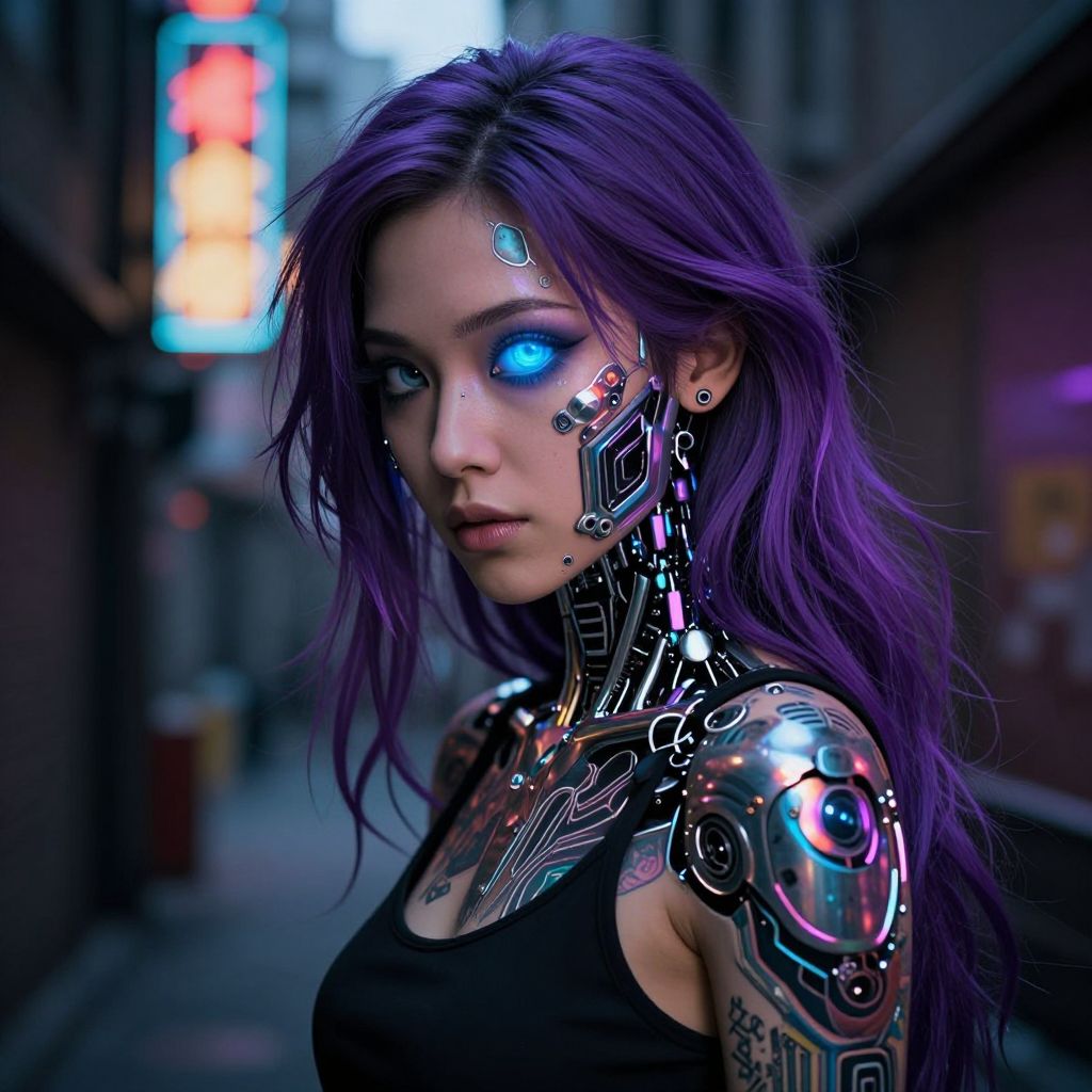 Craft an image embodying cyberpunk digital art aesthetics, portraying a close-up portrait of a Korean woman with lustrous black hair and cutting-edge armor that resembles a tapestry of glowing neon lights. Her mesmerizing blue eyes serve as the central focus, reflecting the city's dynamic skyline featuring towering structures and luminous billboards. The background gracefully transitions from deep purple to vibrant electric blues and greens, establishing an evocative emotional spectrum that encapsulates both the futuristic and otherworldly qualities of this high-tech warrior navigating through a dense urban environment.