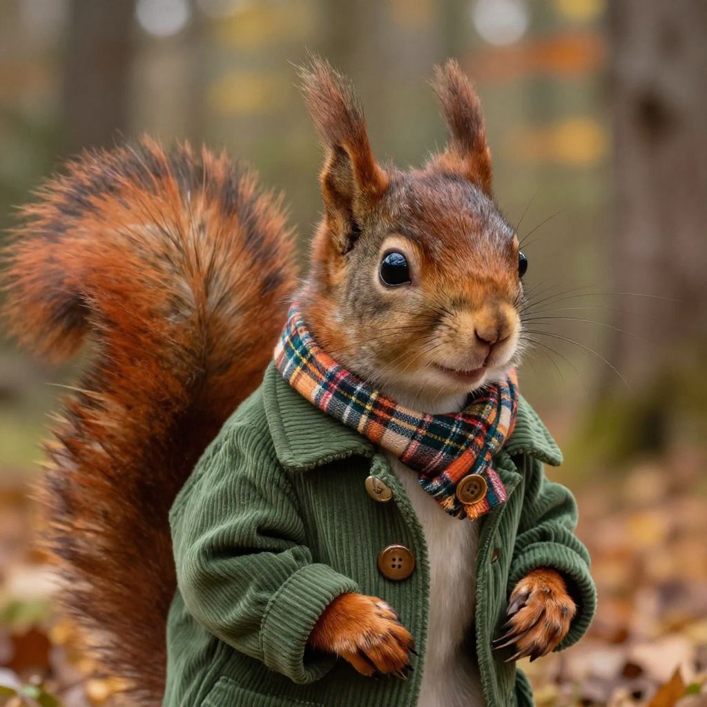 Photograph of a cute, anthropomorphized red squirrel wearing a green corduroy jacket and plaid scarf, standing in an autumn forest.