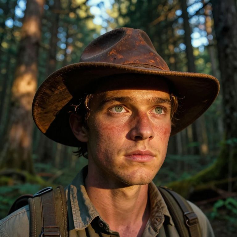 A hyperrealistic portrait of an explorer with sun-kissed skin and timid green eyes, viewed from a unique bug's-eye perspective as they forge their way through untamed wilderness. The image captures resilience and curiosity; their contemplative gaze surveys the rugged landscape, and their well-worn leather hat casts dramatic shadows across their world-weary features. Lit by golden hour light filtering through towering trees, this portrait combines natural textures and intricate details, evoking awe for nature's untamed beauty and admiration for those who dare to venture into its heart.
