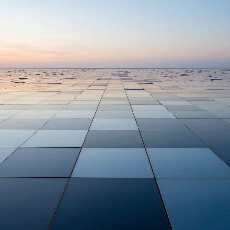 Photograph of a modern, minimalist architectural surface featuring a large, grid-like pattern of square tiles. The tiles are arranged in a checkerboard pattern, with alternating shades of blue, gray, and white. The surface extends into the horizon, where the sky transitions from a soft pinkish-orange at the top to a light blue at the bottom. The tiles have a reflective, glass-like texture, and the grid lines are slightly darker, creating a sense of depth. The overall image conveys a sleek, futuristic, and expansive feel.