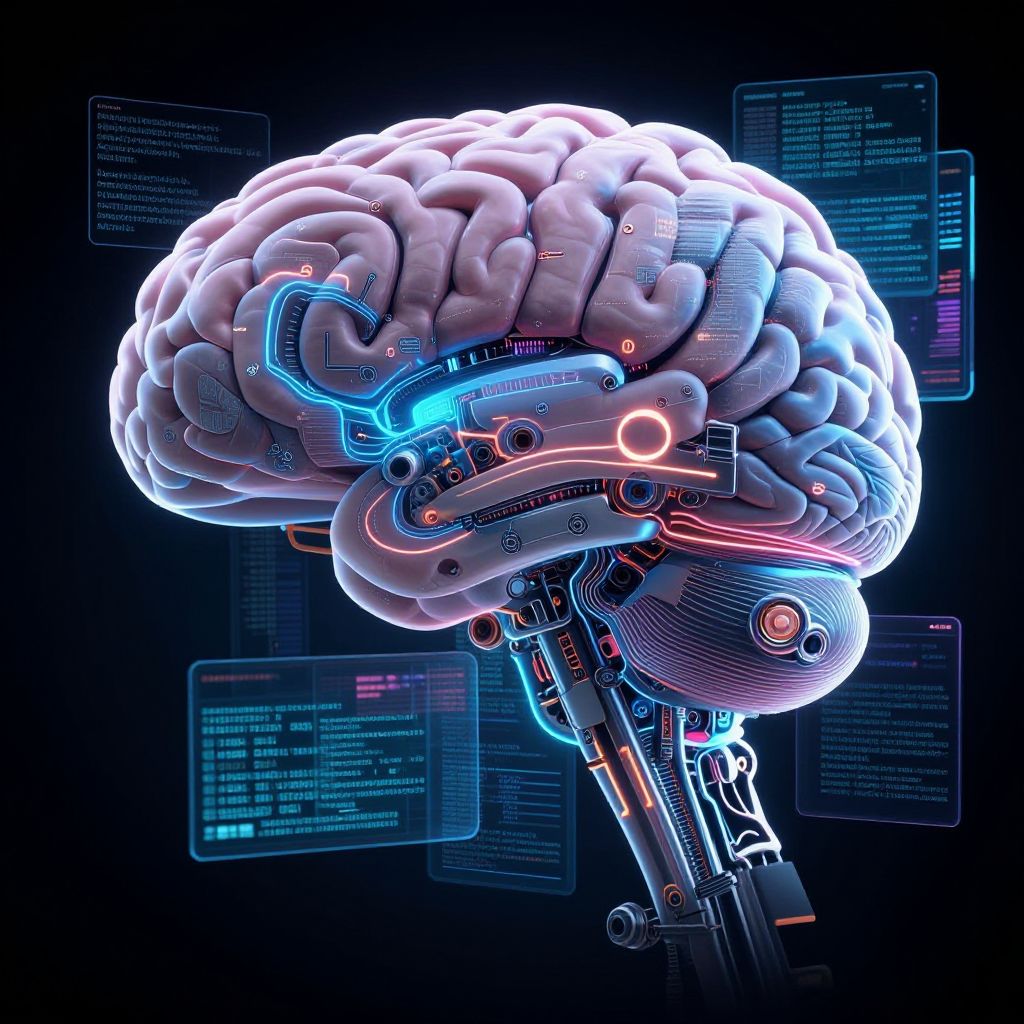 Ai complete image of a human brain merging with mechanical components and digital code, symbolizing artificial intelligence and machine learning, intricate details, neon accents, dark background with bright holographic overlays, hyperrealistic style