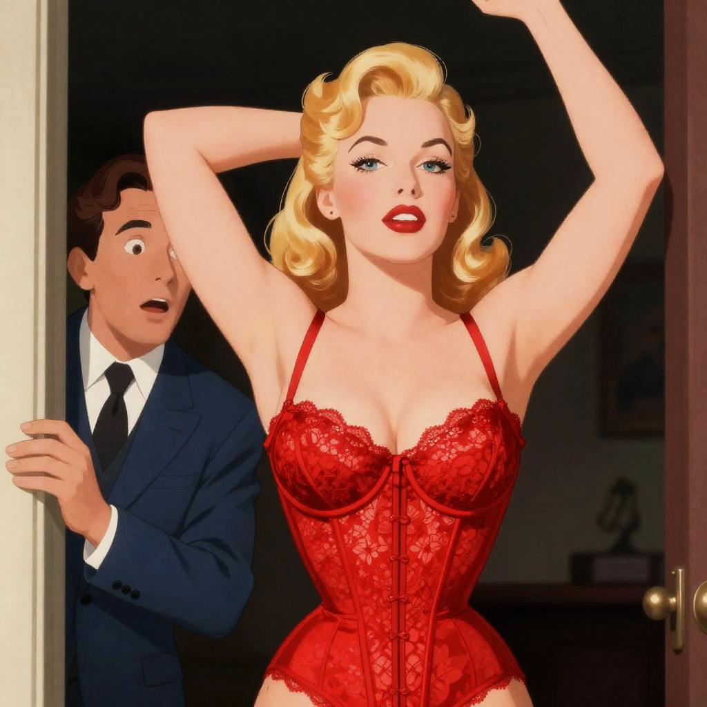 Vintage-style illustration: blonde woman with red lace corset, arms raised, confident expression, left; man in blue suit, peeking through door, surprised expression, right. Dark background. Woman's left, man's right. Woman's chest prominent, man's face partially visible.