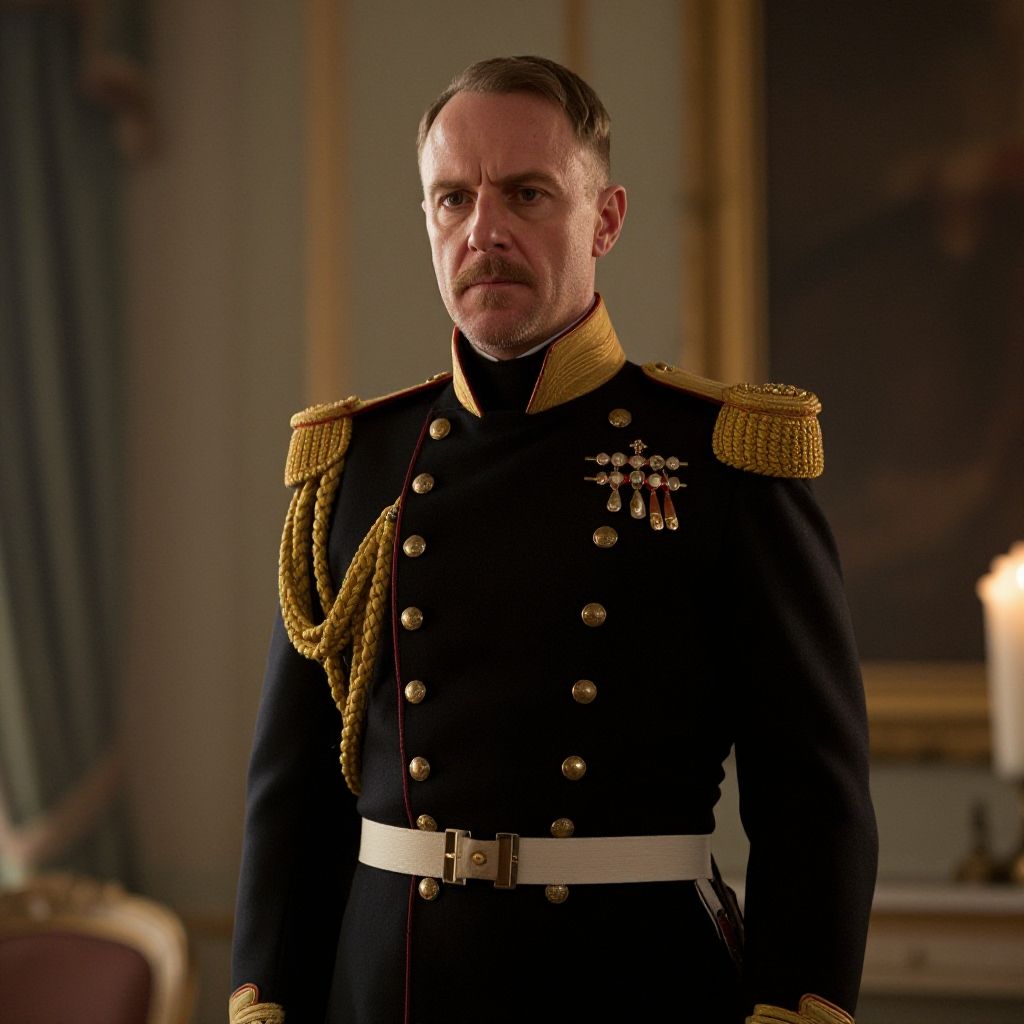 Photograph of a stern-looking middle-aged white man with short brown hair and a mustache, wearing a formal black military uniform with gold epaulettes, numerous medals, and a white belt. The uniform is double-breasted with gold buttons. He stands in a dimly lit, elegant room with a blurred background featuring a partially visible painting and a lit candle. The lighting casts a shadow on his right side, highlighting his serious expression. The image has a dramatic, cinematic feel, with rich, warm tones and sharp focus on the subject.
