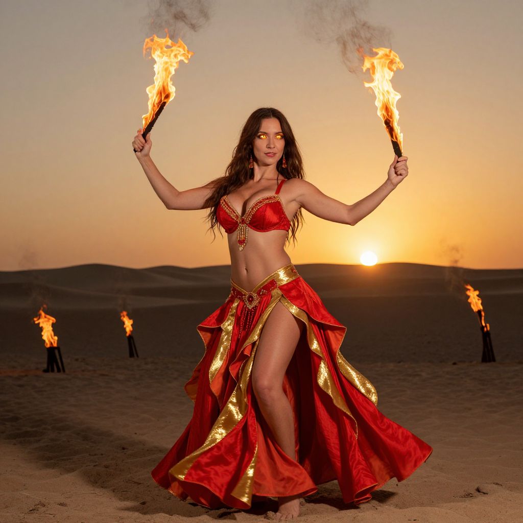 A woman with long brown hair and glowing amber eyes performs a fiery fire dance in a vibrant red and gold fire dance costume, flames licking the edges of the flowing, layered fabric as she moves gracefully in a desert-themed arena under a golden sunset, with sand and torches in the background.. The woman has big breasts and cute face