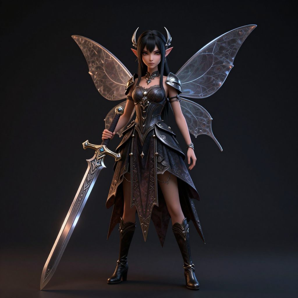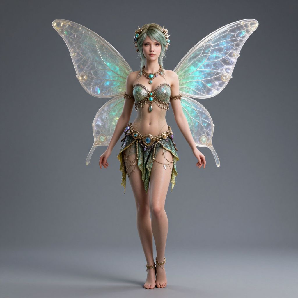 Digital CGI image of a fairy woman with translucent, iridescent wings, wearing a metallic bikini, green leaf skirt, and jeweled accessories, standing