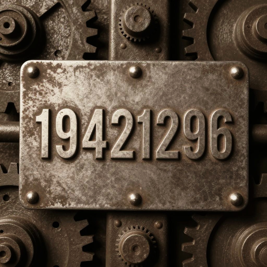 The number 19421296 styled as a vintage military serial code engraved on a weathered metal plate, surrounded by old mechanical gears and rivets, with a sepia tone and textured surfaces, evoking World War II aesthetic.