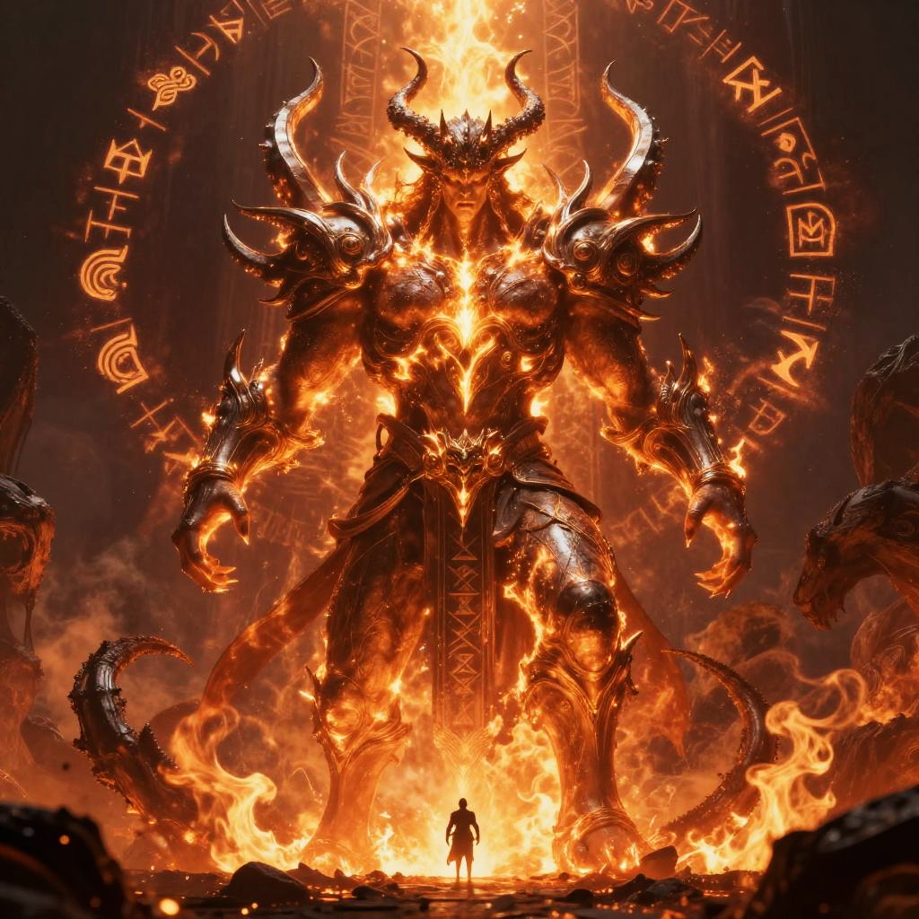 Photorealistic digital artwork depicting a towering, demonic, horned figure engulfed in fiery orange and red flames. The creature, with muscular, armored form and multiple sharp horns, stands centrally, surrounded by a dark, smoky background. Its surface is cracked and glowing with molten lava. A small, silhouetted figure stands at the base, looking up at the monstrous entity. Ancient runes and symbols encircle the demonic figure's head, adding a mystical, ominous feel. The intense flames and dark, shadowy surroundings create a dramatic, apocalyptic atmosphere.