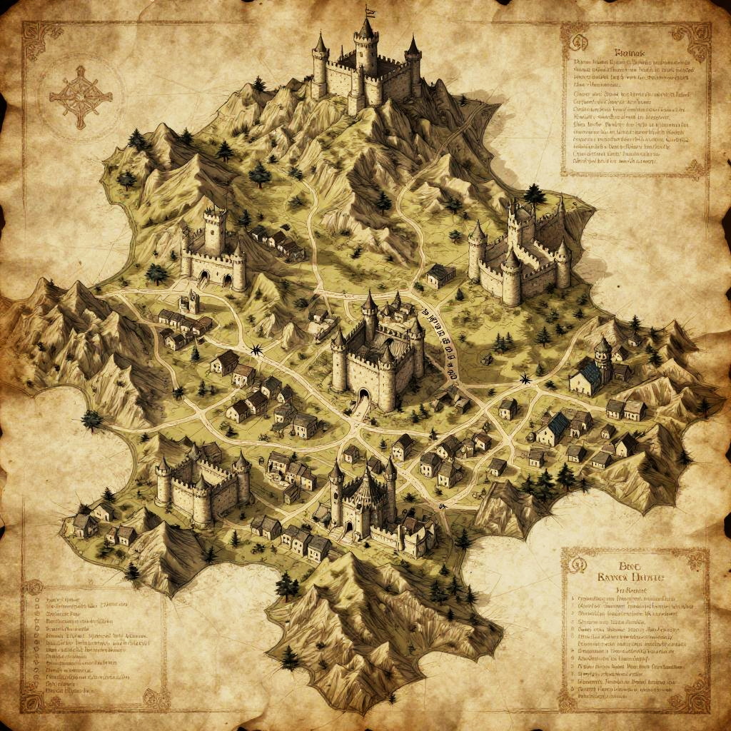 Free AI map generator crafting a detailed medieval kingdom map including castles, villages, roads, and mountain passes, rendered in an old parchment style with sepia tones, inked borders, and decorative cartographic elements reminiscent of classic fantasy atlas.