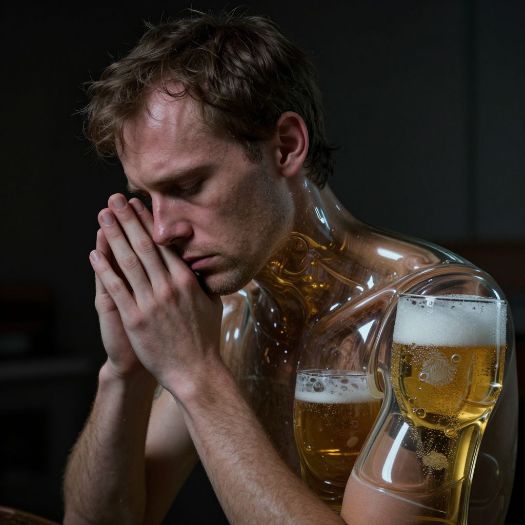 Whisper a photorealistic image of a sad man, but his skin is glass and his insides are filled with beer. Dark, lonely, depressing. Hyper detailed.,