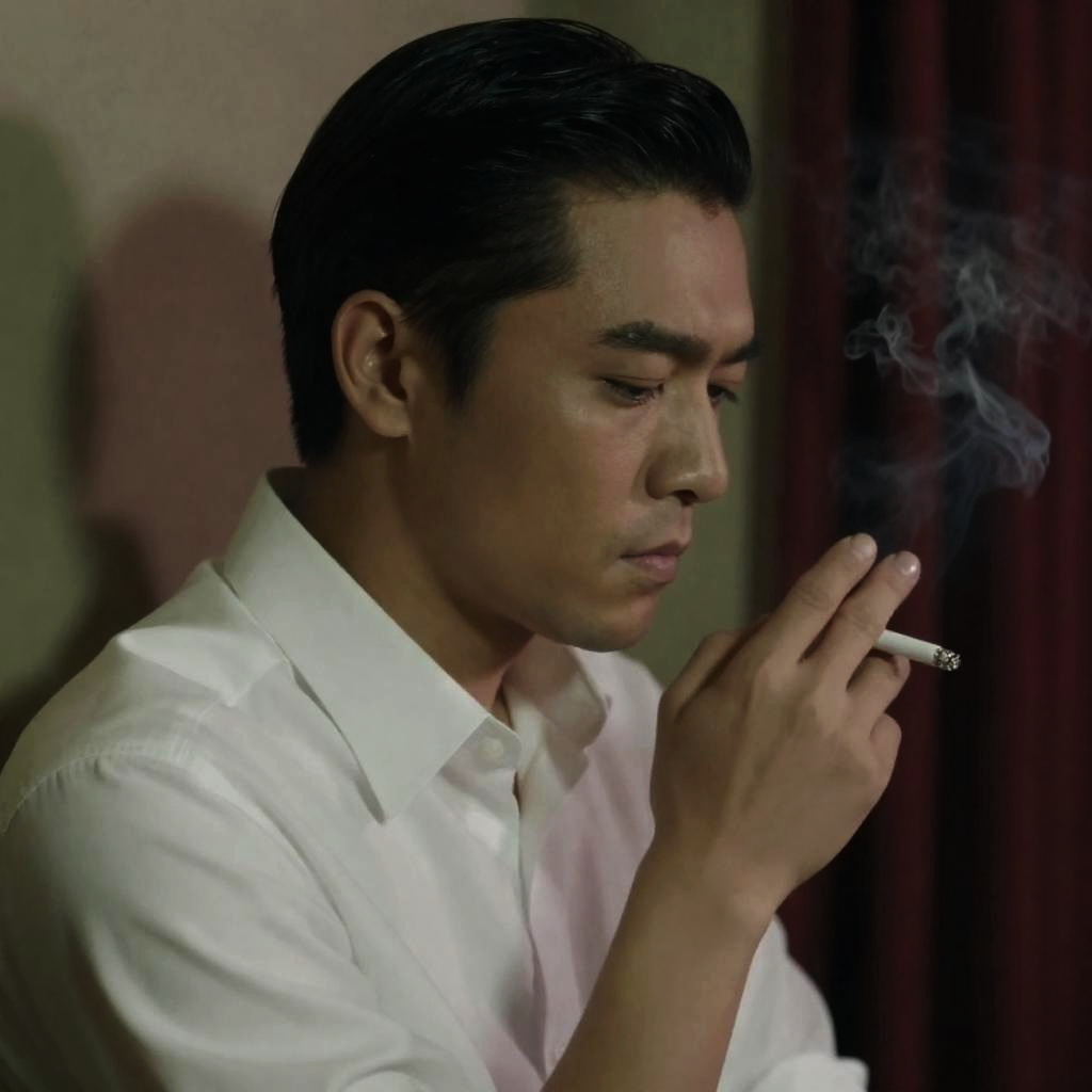 East Asian man with slicked-back black hair, white dress shirt, smoking cigarette. Dimly lit, red patterned curtains on right, blurred background. Man's head tilted down, focused on cigarette, intense expression. Partial view, right side of face and hand.