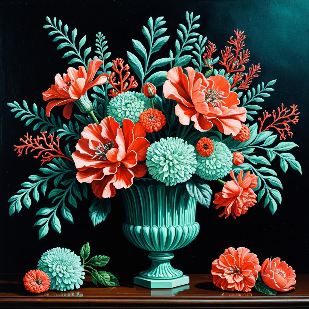 Coral and mint, vivid colors, high contrast, detailed floral arrangement, oil painting, vibrant, realistic, 4k, ultra-detailed, surreal, dynamic lighting, luxurious, botanical, rich textures, modern, decorative, elegant composition