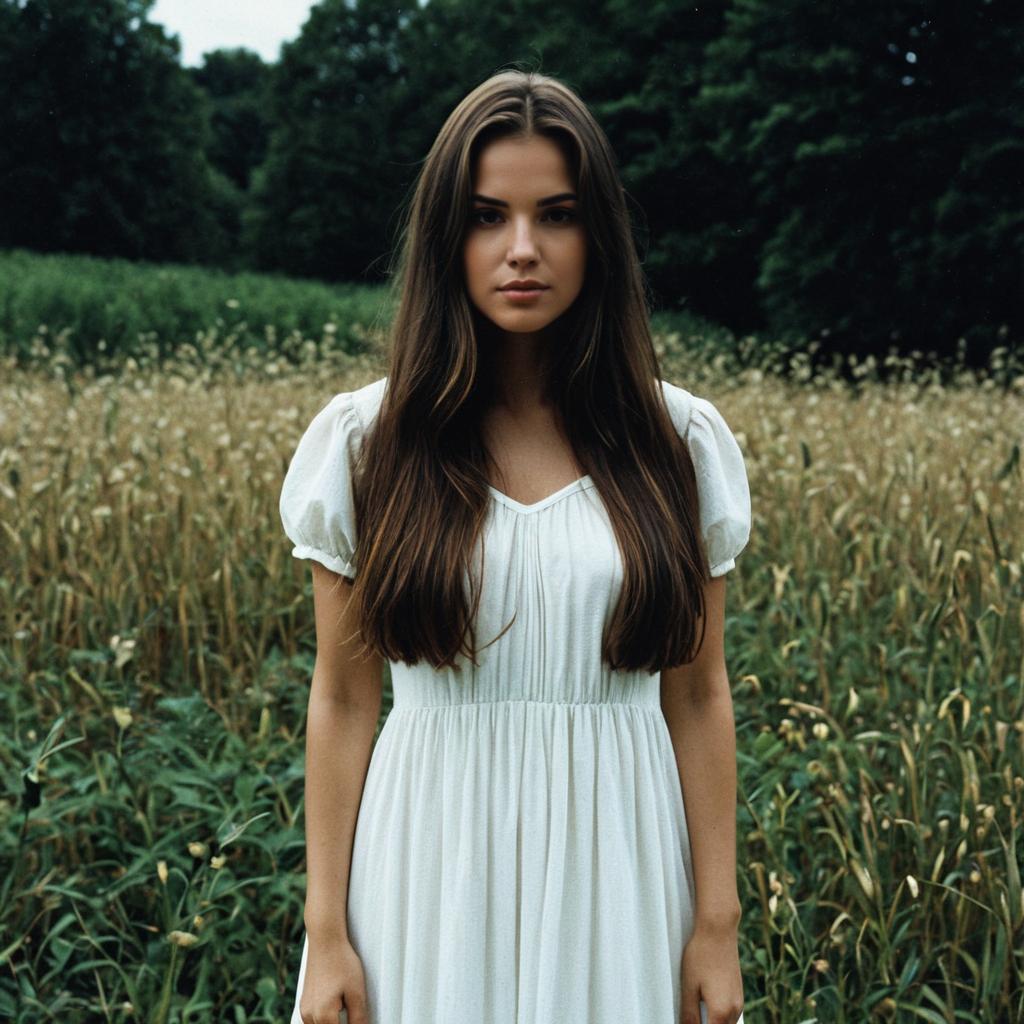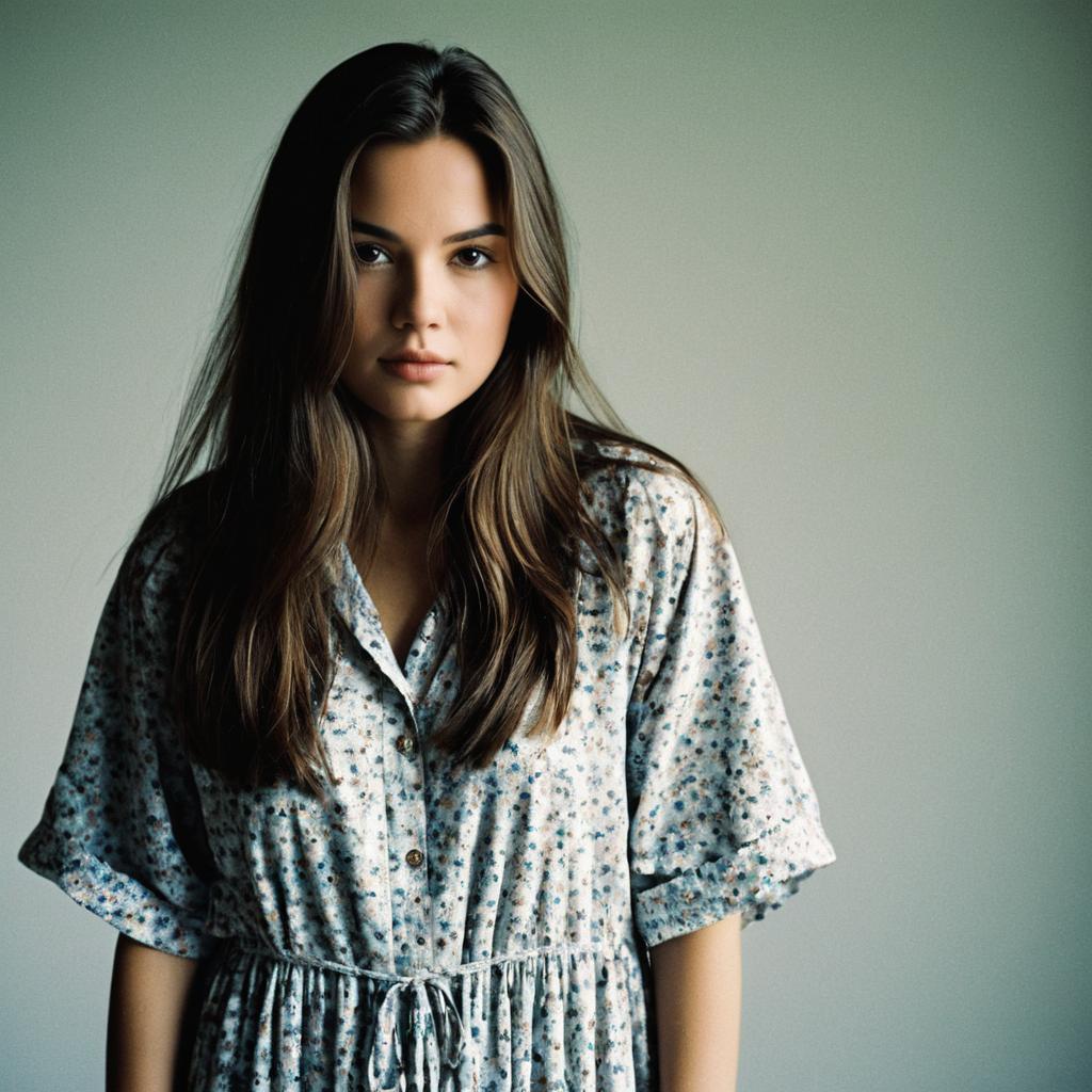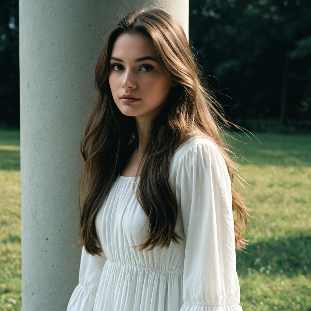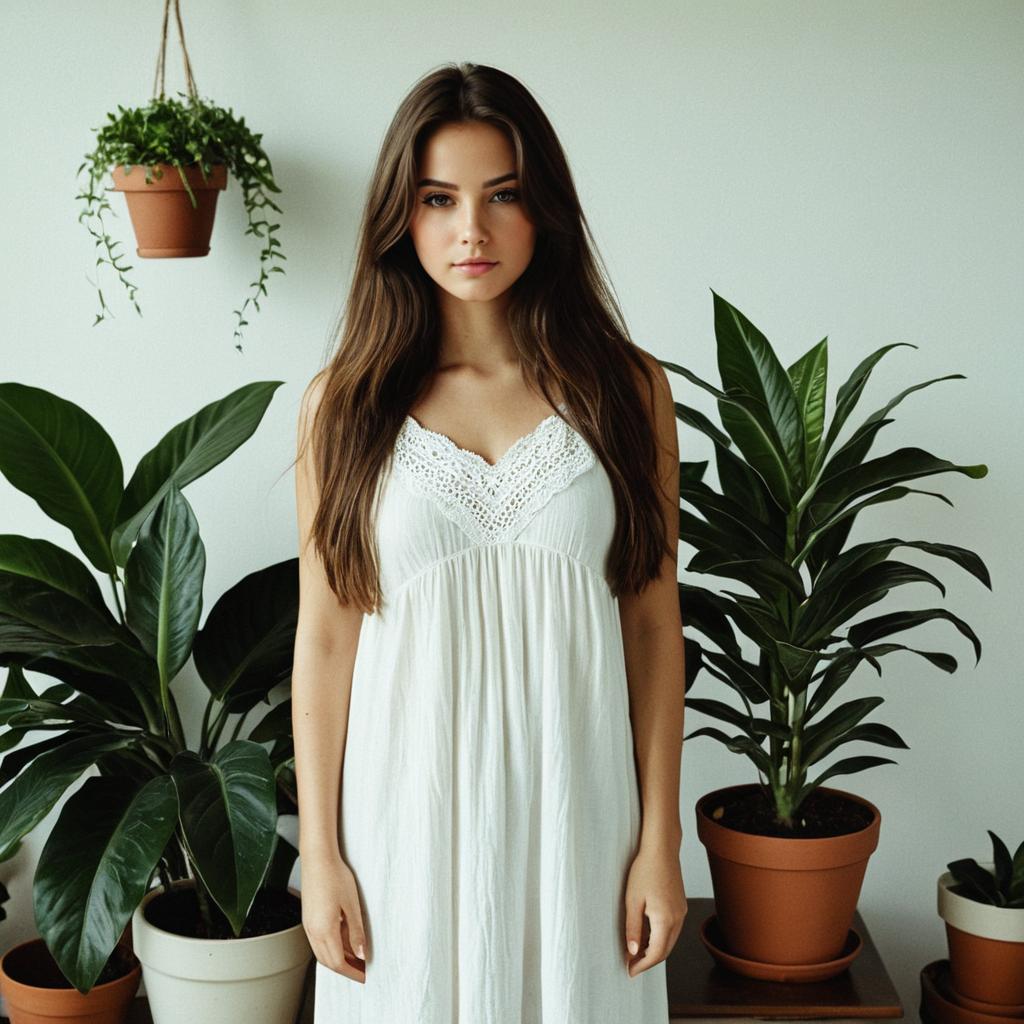 Summer home wear ladies,1girl, solo, brown hair, long hair, realistic, dress, fine art parody, plant, potted plant, brown eyes, looking at viewer, white dress, standing, mole