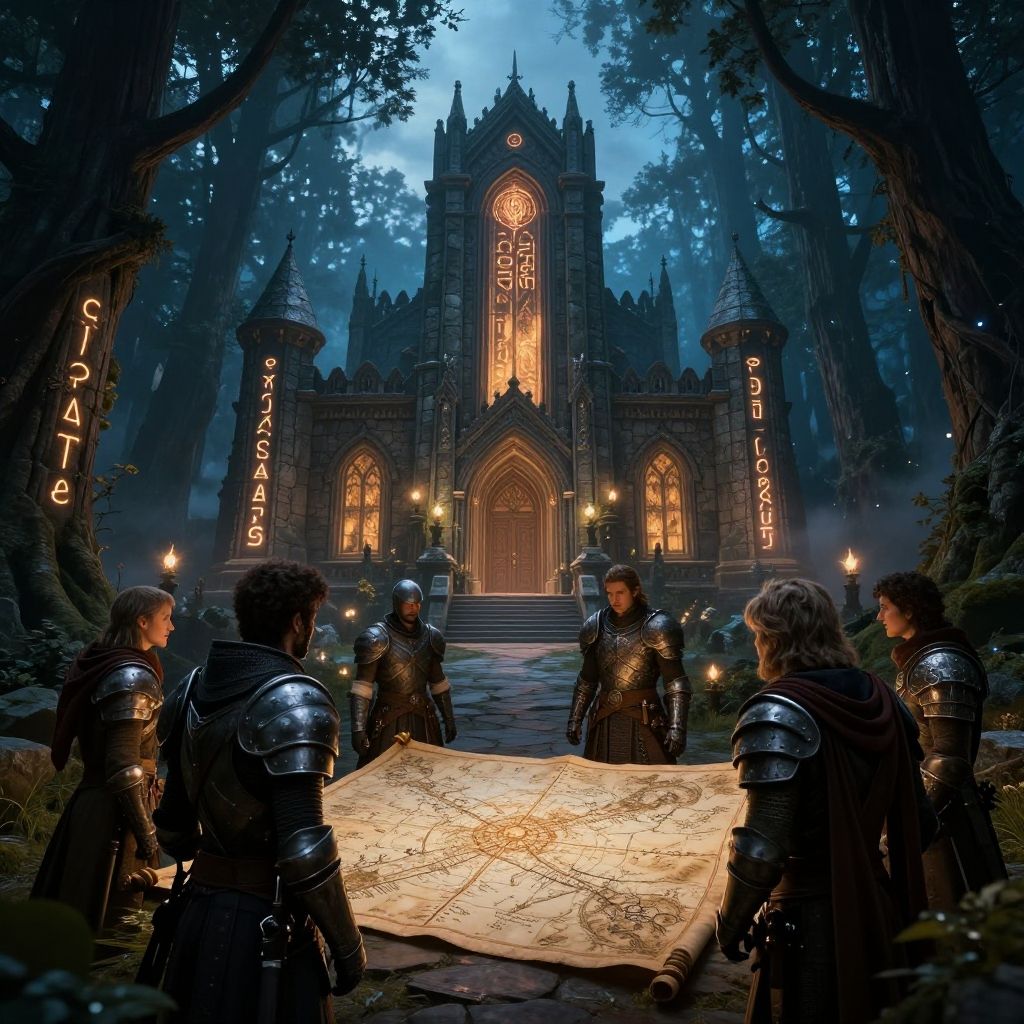 Fantasy guild headquarters nestled in an ancient enchanted forest, glowing magical runes on stone walls, adventurers in detailed armor gathering around a mystical map, twilight ambiance
