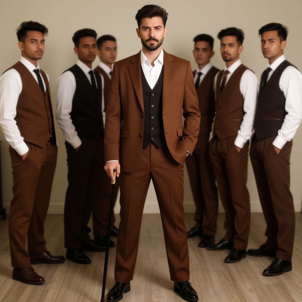 Photograph of a bald man in a blue jacket, white shirt, and blue jeans, standing confidently in front of four men in similar attire, outdoors