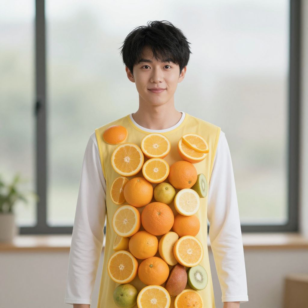 Fruit salad costume, solo, food, fruit, black hair, looking at viewer, blurry background, long sleeves, blurry, window, smile, orange (fruit), male focus