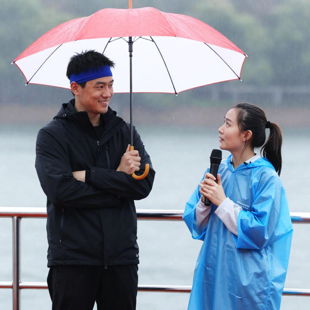 Photograph of two people on a boat deck during rain. Man with blue headband, black jacket, and red-white umbrella stands with arms crossed, smiling. Woman in blue rain poncho holds microphone, looking up at man. Raindrops visible in background. Man on left, woman on right.