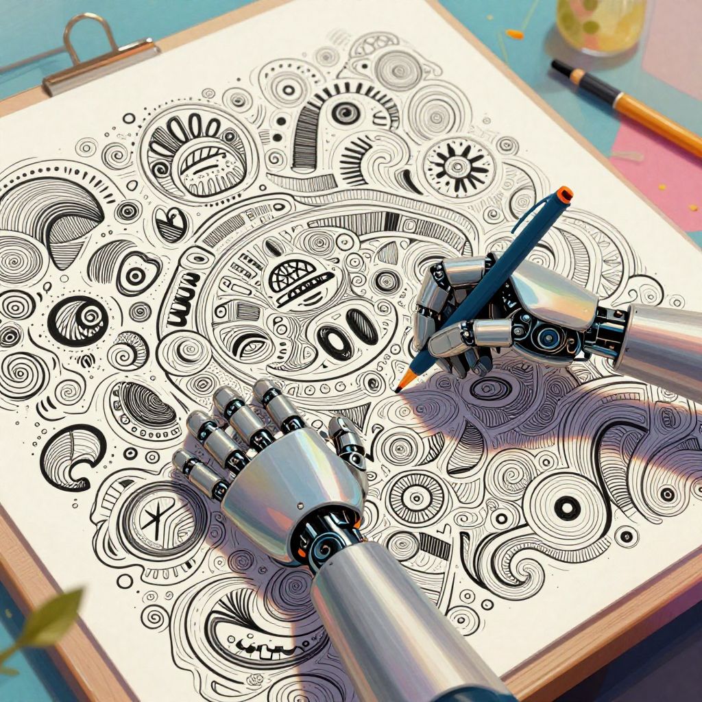 Doodle AI concept in a dreamlike setting with robotic arms creating intricate doodle patterns on a giant canvas, mixed media style combining line art and digital painting, vibrant and whimsical mood with creative energy