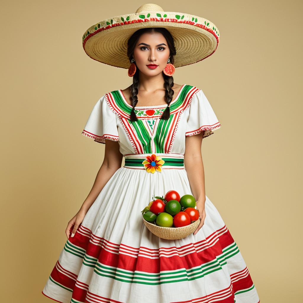 Greek salad costume, photorealistic, female, wearing traditional Mexican dress, white dress with red and green stripes, hat, decorative fruit bouquet on skirt, tomato slices, cucumber slices, lime slices, pepper slices, green leaves, standing, neutral beige background, centered, direct gaze, medium shot, natural light, realistic ures, fashion photography style