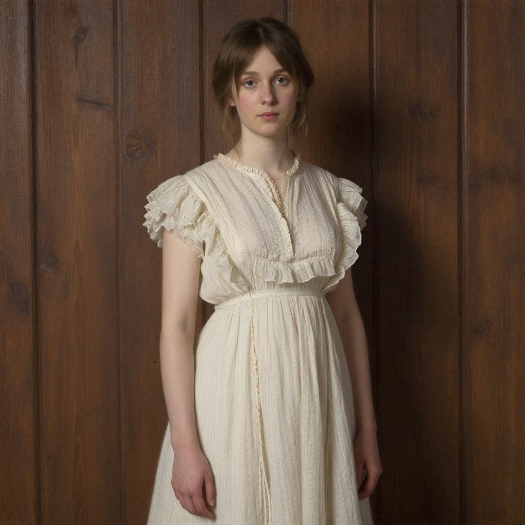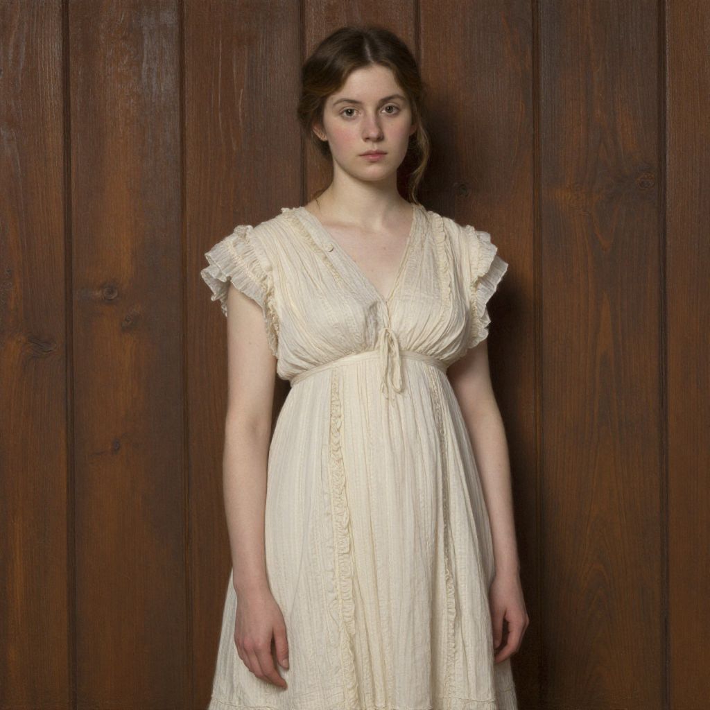 Photograph of a young Caucasian woman with fair skin and brown hair in a loose bun, standing against a wooden paneled background. She wears a cream-colored, short-sleeved, Victorian-style dress with a deep V-neck and subtle lace detailing. Her expression is neutral, and she gazes directly at the camera. The dress has a slightly textured fabric and a gathered waist, giving it a soft, flowing appearance. The wood panel background is dark brown with visible grain patterns, providing a rustic contrast to her delicate attire. The lighting is soft, highlighting her face and dress while casting gentle shadows.