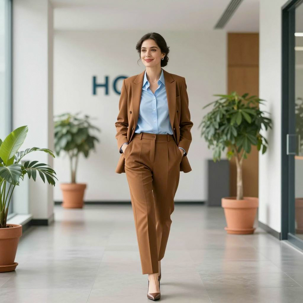 Office lady wear fashion, photograph of a confident woman, standing in a modern office hallway, wearing brown blazer and matching pants, light blue shirt, hands in pockets, dark hair in a bun, slight smile, green plants in terracotta pots in background, bright natural light, polished floor, neutral color walls, "HO" partially visible on wall in background, business casual attire, professional setting, realistic style